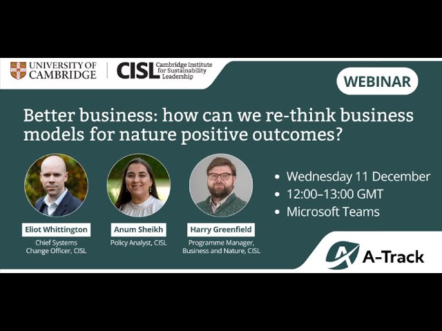 This CISL webinar explores the "Better business: Re-thinking business models for nature positive outcomes" report. Funded by UKRI and EU-Horizon as part of the A-Track project, it advocates for a systemic, transformational shift towards a nature-positive economy, moving beyond operational changes. The aim is to identify and scale profitable business models aligned with global nature goals.